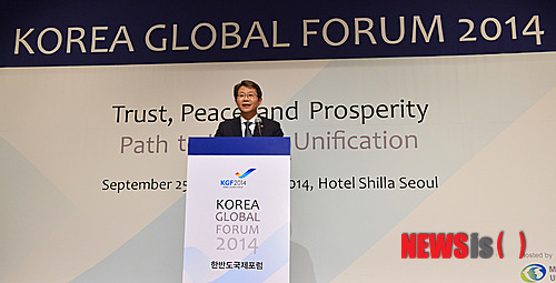 【서울=뉴시스】조종원 기자 = 류길재 통일부 장관이 25일 오전 서울 중구 신라호텔에서 열린 '한반도국제포럼 2014'에 참석해 기조연설을 하고 있다. 2014.09.25.