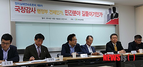 【서울=뉴시스】10일 오전 서울 여의도 자유경제원 회의실에서 '국정감사 : 행정부 견제인가, 민간분야 길들이기인가'라는 주제로 제8차 정치실패 연속토론회가 열리고 있다. 2014.10.10. (사진=자유경제원 제공)