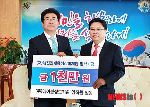 【대전=뉴시스】조명휘 기자 = ㈜에이블정보기술 여준영(왼쪽) 대표이사가 13일 대전시청을 방문해 권선택 시장에게 대전인재육성장학재단 장학기금으로 1000만원을 기탁하고 있다. 2014.10.13. (사진= 대전시 제공)