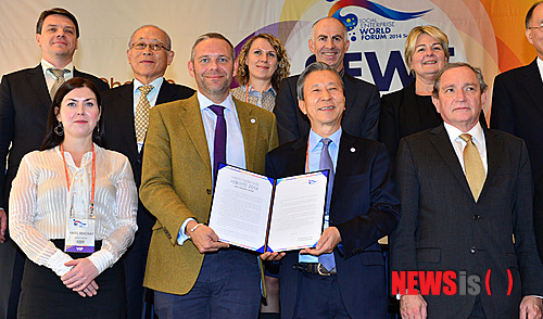 【서울=뉴시스】조종원 기자 = 16일 오후 서울 서초구 더케이서울호텔에서 열린 사회적기업월드포럼 2014 기자회견에서 피터 홀브룩(첫번째 줄 왼쪽 두번째부터) SEWF 2014 세계조직위원장과 최종태 SEWF 2014 한국조직위원장이 서울선언문을 들어보이고 있다. 2014.10.16.