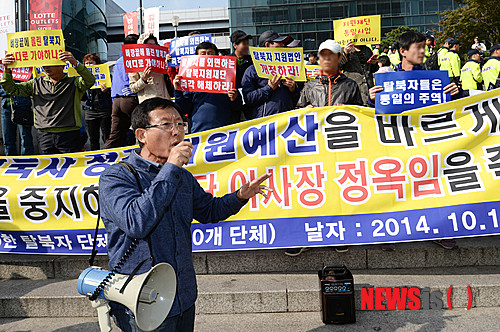 【서울=뉴시스】박문호 기자 = 탈북자연합회 회원들이 19일 오전 서울 용산구 한강대로 서울역광장에서 북한 이탈 주민을 지원하는 남북하나재단이 '탈북자의 요구를 무시하고 있다'며 "지원재단의 별칭 중지, 올바른 예산 집행, 정옥임 남북하나재단 이사장의 해임" 을 촉구하고 있다. 2014.10.19.
