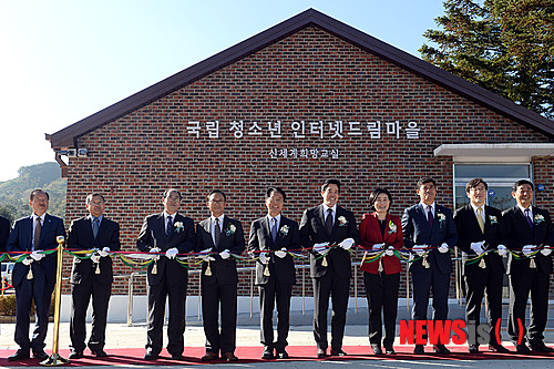 【무주=뉴시스】최동준 기자 = 27일 오후 전북 무주군 안성면 구 공진초등학교에서 국립 청소년 인터넷드림마을 개관식이 열렸다. 왼쪽 네번째부터 김군선 신세계그룹 부사장, 이형규 전북 정무부지사, 정용진 신세계그룹 부회장, 김희정 여성가족부 장관, 박민수 새정치민주연합 의원, 권승 한국청소년상담복지개발원장을 비롯한 참석자들이 기념 테이프 커팅을 하고 있다.