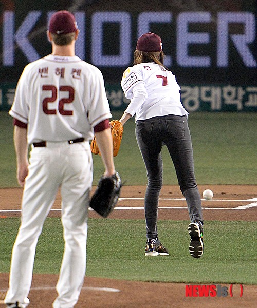 【서울=뉴시스】박영태 기자 = 28일 오후 서울 목동야구장에서 열린 ‘2014프로야구’ 플레이오프 넥센 히어로즈와 LG트윈스의 2차전 경기에서 가수 유이가 시구를 하고 있다. 2014.10.28.