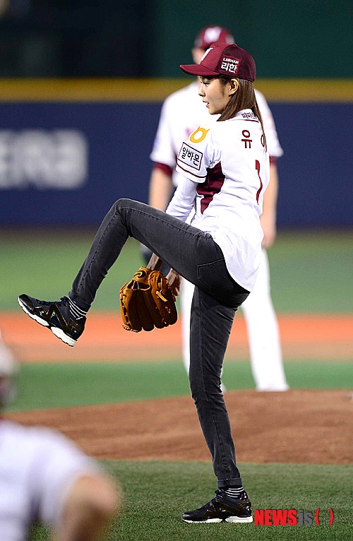 【서울=뉴시스】전신 기자 = 28일 오후 서울 목동야구장에서 열린 2014 프로야구 플레이오프 2차전 넥센 히어로즈와 LG 트윈스의 경기 시작 전 애프터스쿨 유이가 시구를 하고 있다. 2014.10.28.