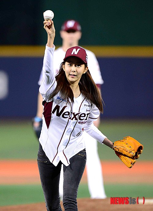 【서울=뉴시스】전신 기자 = 28일 오후 서울 목동야구장에서 열린 2014 프로야구 플레이오프 2차전 넥센 히어로즈와 LG 트윈스의 경기 시작 전 애프터스쿨 유이가 시구를 하고 있다. 2014.10.28.