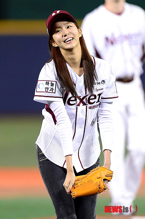 【서울=뉴시스】전신 기자 = 28일 오후 서울 목동야구장에서 열린 2014 프로야구 플레이오프 2차전 넥센 히어로즈와 LG 트윈스의 경기 시작 전 애프터스쿨 유이가 시구를 하고 있다. 2014.10.28.