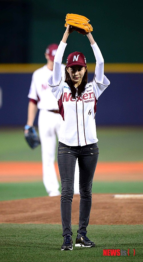 【서울=뉴시스】전신 기자 = 28일 오후 서울 목동야구장에서 열린 2014 프로야구 플레이오프 2차전 넥센 히어로즈와 LG 트윈스의 경기 시작 전 애프터스쿨 유이가 시구를 하고 있다. 2014.10.28.