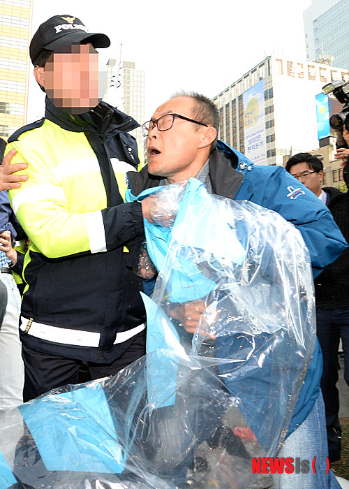 【서울=뉴시스】박문호 기자 = 세월호 참사 200일(11월 1일)을 앞둔 29일 오후 서울 종로구 세종로 광화문광장 이순신 동상 앞에서 민주민생평화통일주권연대 주최로 열린 제3차 '세월호 참사 진상규명 촉구 전단 풍선을 날리기'에서 헬륨 가스 주입을 시도하던 회원이 경찰에 의해 제지 되고 있다. 2014.10.29.