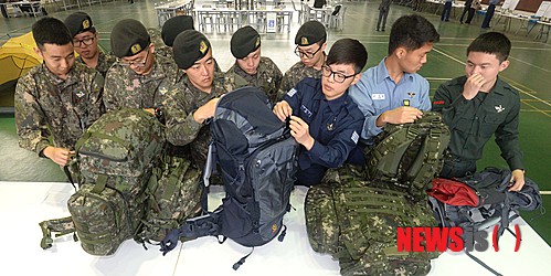 【계룡=뉴시스】함형서 기자 = 국방부는 30일 오전 충남 계룡대 계룡체육관에서 장비,피복, 장구류등 군수품 54개 품목에 대해 ‘군수품 품평회’ 를 개최, 군장병들이 전투형 배낭을 구경하고 있다. 2014.10.30.