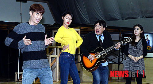 【서울=뉴시스】조수정 기자 = 뮤지컬 '올슉업(ALL SHOOK UP)' 출연진이 30일 오후 서울 연지동 아리온 연습실에서 공연 연습을 하고 있다. 왼쪽부터 배우 손호영, 가희, 안세하, 정재은.