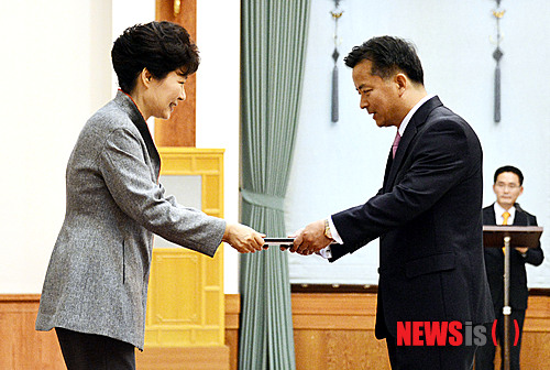 【서울=뉴시스】홍찬선 기자 = 박근혜 대통령이 31일 오후 청와대에서 열린 신임 대사 신임장 수여식에 참석해 여운기 주가나대사에게 신임장을 수여하고 있다. 2014.10.31.