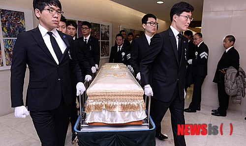 【서울=뉴시스】김인철 기자 = 故 이동찬 코오롱그룹 명예회장의 발인식이 엄수된 12일 서울 신촌 세브란스병원 장례식장에서 유가족과 지인들이 고인의 영정사진을 들고 운구차로 이동하고 있다. 2014.11.12.