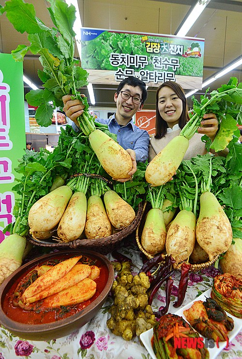 농협유통은 천수무 외에 알타리무와 순무, 돌산갓 등 다양한 김치재료와 젓갈류 등을 최대 50% 할인해 내달 14일까지 김장대잔치를 진행한다.