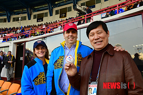 사진은 지난 8일 마크 리퍼트 대사 내외가 서울 목동야구장에서 열린 한국시리즈 4차전 삼성라이온즈-넥센히어로즈 경기에서 허구연 해설위원과 기념촬영을 하는 모습. 2014.11.17. (사진=마크 리퍼트 대사 블로그)
