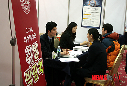 【서울=뉴시스】20일 서울 광진구 세종대학교(총장 신구) 광개토관 컨벤션센터에서 개최된 ‘2014 취업박람회’에서 기업 부스를 찾은 취업준비생들이 취업 컨설팅을 받고 있다. 2014.11.20. (사진=세종대학교 제공)