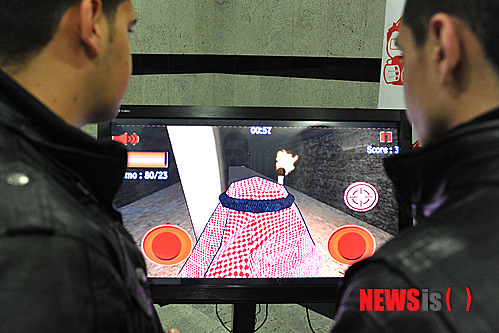 행사 참가자들이 코피아(아랍 두건)가 등장한 아랍 스타일의 비디오게임을 지켜보고 있다. 2014.11.22.