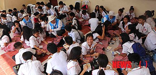 【서울=뉴시스】경기사진공동취재단 = 3일(현지시각) 필리핀 마닐라 에서 대한적십자사 경기도지사와 한국전력기술(KEPCO E&C) 임직원으로 구성된 ‘제3기 국제구호활동 해외봉사단’이 학생들에게 급식을 배식한 후 대화를 나누고 있다. 2014.12.03.