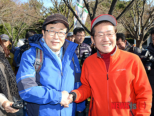 【부산=뉴시스】허상천 기자 = 서병수 부산시장과 홍준표 경남지사를 비롯한 양 시·도간부 20여명은 6일 오전 10시30분 부터 약 2시간 동안 해운대 장산을 등산하면서 양 시·도 현안에 대해 의견을 나누고 앞으로 협력해 나갈 것을 다짐했다. 2014.12.06. (사진 = 부산시 제공)