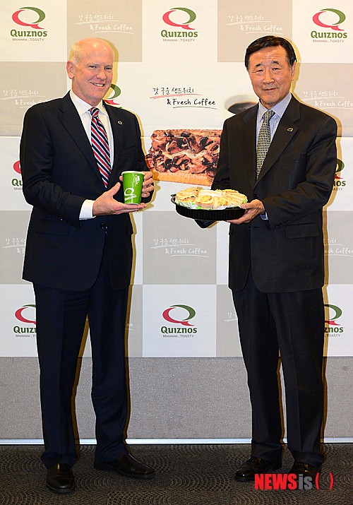 【서울=뉴시스】김진아 기자 = 11일 오후 서울 중구 서울스퀘어에서 열린 '퀴즈노즈 글로벌 CEO 방한 기자간담회'에서 스튜어트 매티스(Stuart Mathis, 왼쪽) 퀴즈노스 글로벌 CEO와 김영덕 유썸 퀴즈노스 코리아 대표이사가 포토타임을 갖고 있다.