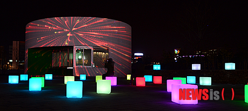 【광주=뉴시스】류형근 기자 = 23일 오후 광주 동구 국립아시아문화전당 외벽에서 레이저를 활용한 '빛의 예술 공연'이 펼쳐지고 있다. 이번 공연은 내년 1월6일까지 매일 오후 6시부터 자정까지 열린다. 2014.12.23.