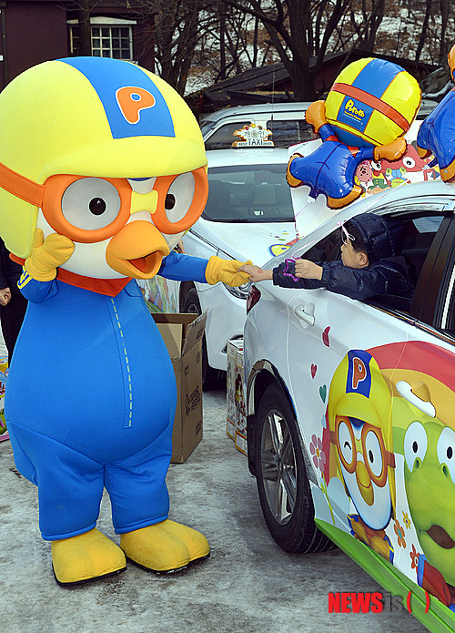 【서울=뉴시스】최동준 기자 = 성탄절을 하루 앞둔 24일 오후 서울 중구 아동복지시설인 남산원에서 어린이들이 뽀로로택시를 타며 즐거운 시간을 보내고 있다. 서울시는 뽀로로택시 20대와 함께 어린이들을 초대해 성탄선물을 전달하고 시내를 한바퀴 돌아보는 행사를 진행했다. 2014.12.24.