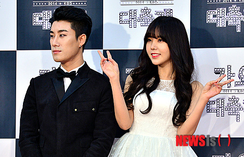 【서울=뉴시스】조종원 기자 = 26일 오후 서울 영등포구 KBS에서 열린 '2014 KBS 가요대축제'에서 가수 레이나와 산이가 포즈를 취하고 있다. 2014.12.26.