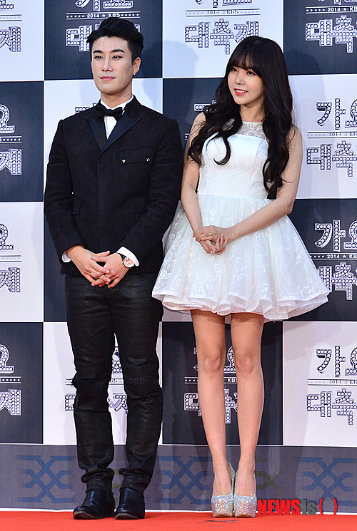 【서울=뉴시스】조종원 기자 = 26일 오후 서울 영등포구 KBS에서 열린 '2014 KBS 가요대축제'에서 가수 레이나와 산이가 포즈를 취하고 있다. 2014.12.26.