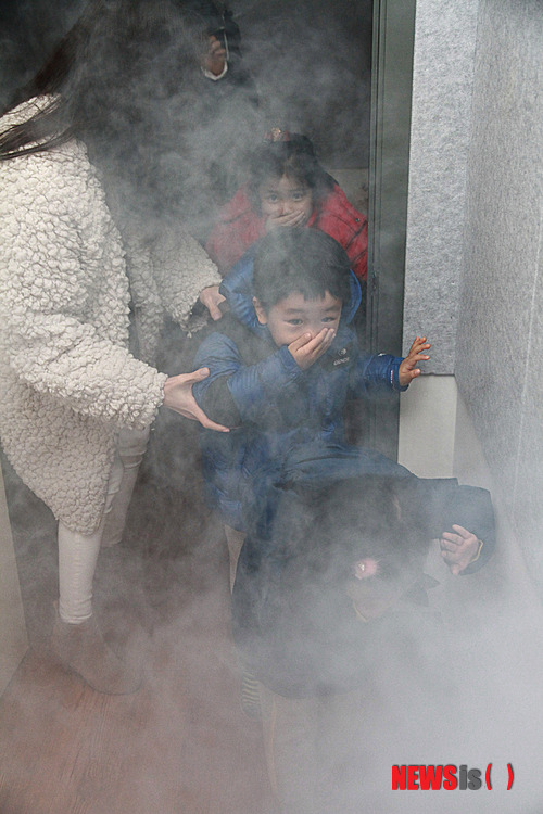 【서울=뉴시스】구로소방서(서장 김송연)가 9일 서울 구로구 본서에서 아이슐레유치원 원생 및 지도교사를 대상으로 '꾸러기 소방관 체험학습'을 운영한 가운데 어린이들이 연기대피체험을 하고 있다. 2015.01.09. (사진=구로소방서 제공)