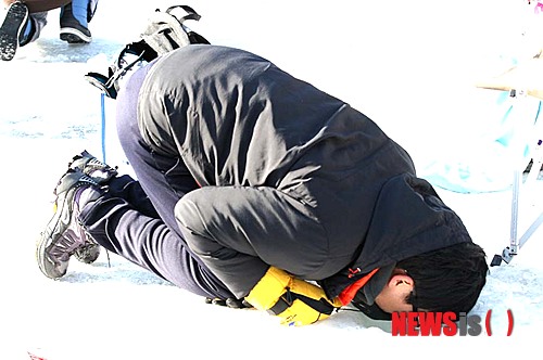 【화천=뉴시스】김영준 기자 = 17일 오전 강원 화천군 화천읍에서 '2015 산천어축제'가 열리고 있는 가운데 축제를 찾은 관광객이 얼음 구멍에 시선을 고정하고 산천어의 동선을 살피고 있다. 2015.01.17.