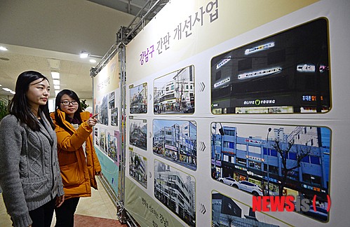 오는 23일까지 열리는 이번 전시회는 간판개선사업에 참여한 간판 제작 및 설치 업체가 디자인, 설치, 시공을 재능 기부해 추진된다. 전시회에는 선릉로 주요 건물 10개와 도산대로 2개 건물의 개선 전 모습과 개선 후 모습을 비교한 사진작품 등을 선보이며, 2018년까지 단계적으로 추진되는 사업 예정 구간도 미리 알 수 있다. 2015.01.19.