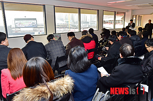 【수원=뉴시스】김경호 기자= 올해 첫 1군에 데뷔하는 프로야구 10구단 kt-wiz가 19일 오전 10시20분 경기 수원시 종합운동장 야구장 기자실에서 브리핑을 열고 3월7일 구장 준공식과 함께 첫 시범경기가 열린다고 밝혔다. 2015.01.19(사진= 수원시 제공)
