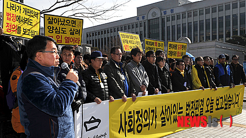 【광주=뉴시스】류형근 기자 = 20일 오후 광주 동구 광주고등법원 앞에서 세월호 실종자·희생자·생존자 가족대책위원회가 세월호 선장과 선원 등에 대한 항소심 재판이 열리기 앞서 기자회견을 열고 "항소심 재판에서 세월호 참사에 대한 진실이 규명 돼야 한다"고 촉구하고 있다. 2015.01.20.