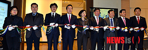 【서울=뉴시스】조종원 기자 = 23일 오후 서울 강서구 겸재정선미술관에서 열린 '故 황금자 할머니 1주기 추모 기획전 및 장학금 수여식'에서 노현송(왼쪽 네번째) 강서구청장을 비롯한 참석자들이 테이트 커팅을 하고 있다. 2015.01.23.