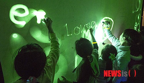 【서울=뉴시스】대림산업은 지난 23일 서울 경복궁역 인근에 위치한 대림미술관에서 아파트 계약자 가족을 대상으로 예술체험활동 교육프로그램인 ‘오렌지 아트스쿨'을 진행했다. 계약자 가족과 아이들이 특수조명과 스크린을 이용해 빛으로 그림을 그리는 ‘라이트 드로잉’ 공연을 관람하고 직접 참여하는 시간을 가지고 있다. 2015.01.26. (사진=대림산업 제공)