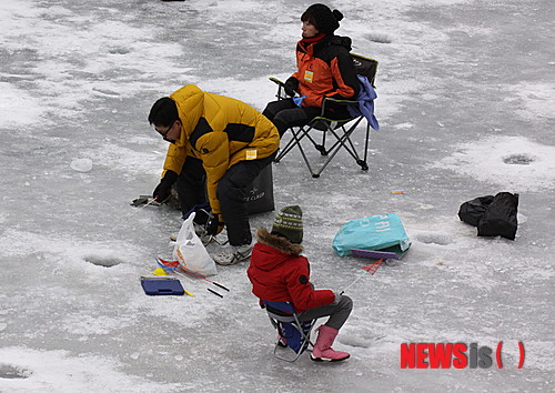 【화천=뉴시스】한윤식 기자 = 강원 화천군 화천천 일대에서 열리는 산천어축제가 연일 성황을 이루고 있는 가운데 29일 많은 사람들이 찾아 얼음낚시를 즐기고 있다.2015.01.29.