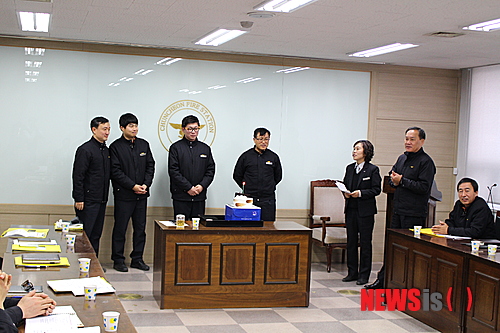 【춘천=뉴시스】박혜미 기자 = 강원 춘천소방서(서장 박창진)가 2일 소방서 소회의실에서 1, 2월에 생일을 맞은 5명의 소속 직원들에게 생일파티를 열고 축하를 전하고 있다. 2015.02.02. (사진=춘천소방서 제공)
