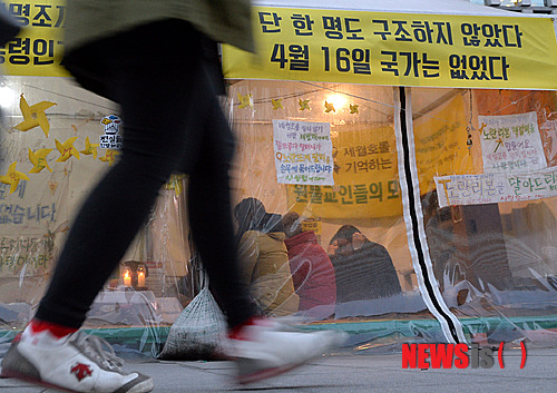 【서울=뉴시스】최동준 기자 = 세월호 참사 발생 300일을 하루 앞둔 8일 오후 서울 광화문광장 세월호 농성장에 추모 미사가 열리고 있다. 2015.02.08.