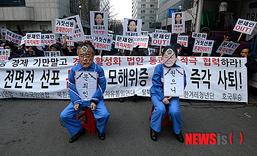 【서울=뉴시스】박상훈 기자 = 어버이연합이 10일 오후 서울 여의도 새정치민주연합 당사 앞에서 문재인 대표와 권은희 의원을 규탄하는 집회를 열고 있다. 2015.02.10.