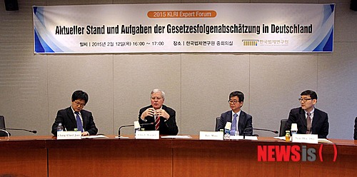 【서울=뉴시스】김인철 기자 = 12일 세종시 한국법제연구원 중회의실에서 독일 함부르크 대학원 울리히 카르펜(왼쪽 두번째, Ulrich Karpen) 교수가 '독일 입법평가의 현황과 과제'를 주제로 발표하고 있다. 2015.02.12. (사진=한국법제연구원 제공)