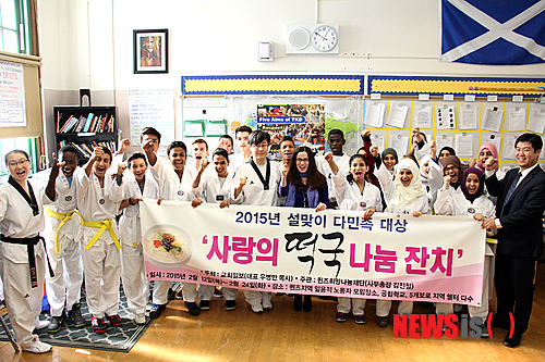 【뉴욕=뉴시스】노창현 특파원 = 민족의 명절 설날을 앞두고 뉴욕 뉴저지의 학생들과 다민족 저소득층을 위한 사랑의 떡국 행사가 펼쳐지고 있다. 교회일보(대표 우병만목사)가 주최하고 퀸즈희망나눔재단(사무총장 김진철)이 주관하는 '사랑의 떡국 나눔 잔치'는 지난 12일부터 24일까지 7차례에 걸쳐 총 5000인분의 즉석떡국이 제공된다. 13일 브롱스의 BLI 공립학교에서는 태권도를 배우는 학생들 100여명과 교직원들이 200인분의 즉석 떡국을 시식했다. ‘코리아태권도’ 레지나 임 대표(왼쪽)가 떡국의 의미를 소개했고 태권도 수업에서는 학생 대표 3명이 줄리 나리마 교장(가운데)과 송재헌 코리아태권도 관장, 김진철 사무총장(오른쪽)에게 세배를 하며 어른을 공경하는 한국 문화 체험도 했다. 2015.02.14. <사진=교회일보 제공>