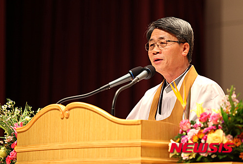 【서울=뉴시스】박동욱 기자 = 지난 28일 전북 익산시 원광디지털대학교에서 열린 '2015학년도 입학식'에서 신명국 이사장이 치사를 하고 있다. 2015.03.01. (사진=원광디지털대학교 제공)