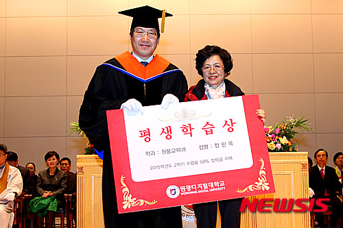 【서울=뉴시스】박동욱 기자 = 지난 28일 전북 익산시 원광디지털대학교에서 열린 '2015학년도 입학식'에서 남궁문(왼쪽) 총장과 '평생학습상'을 수상한 원불교학과 신입생 정민옥(71)씨가 기념촬영을 하고 있다. 2015.03.01. (사진=원광디지털대학교 제공)