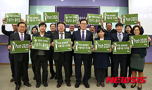 【서울=뉴시스】한국스카우트연맹(총재 함종한)은 5일 서울 여의도 한국스카우트연맹회관 스카우트홀에서 온실가스종합정보센터(센터장 유승직), 해피빈(대표 최인혁)과 ‘미래세대에게 아름다운 지구를' - Post-2020 업무 협약을 체결했다. 함종한 총재 및 참석자들이 '미레세대에게 아름다운 지구를' post-2020 피켓을 들고 환하게 웃고 있다. 2015.03.05. (사진=한국스카우트연맹 제공)