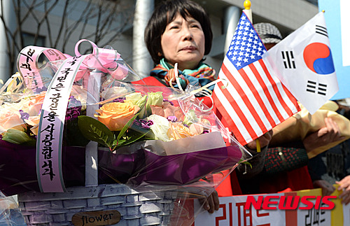 【서울=뉴시스】고범준 기자 = 엄마부대봉사단 회원들이 6일 오후 서울 서대문구 신촌세브란스 병원 앞에서 입원한 마크 리퍼트 주한미대사의 쾌차를 기원하는 피켓과 꽃다발을 들고 취재진과 대화를 하고 있다. 2015.03.06.
