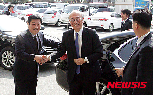 【청주=뉴시스】이병찬 기자 = 9일 2015동아시아문화도시 청주 개막식 참석차 충북 청주시청을 방문한 벳쇼 코로 주한 일본대사가 마중나온 남성현(왼쪽) 청주시 안전행정국장과 악수하고 있다.2015.03.09.