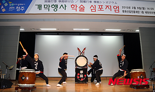 【청주=뉴시스】이병찬 기자 = 9일 충북 청주시 내덕동 문화산업진흥재단 영상관에서 열린 2015동아시아문화도시 개막 워크숍에서 일본 니가타 공연팀 반다이 타이코 카류가 대북 공연을 선보이고 있다.2015.03.09.(사진=청주시 제공)