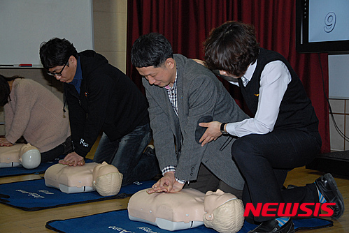 【서울=뉴시스】용산소방서(서장 임선호)가 12일 서울 용산구 갈월동에 위치한 서울시립청소년미디어센터를 방문해 직원들을 대상으로 심폐소생술 교육을 실시하고 있다. 2015.03.12. (사진=용산소방서 제공)