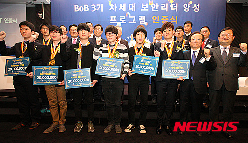 【서울=뉴시스】미래창조과학부와 한국정보기술연구원이 12일 오후 서울 강남구 삼정호텔에서 '제3기 차세대 보안리더 양성(BoB) 프로그램 인증식' 을 개최한 가운데 최재유 미래창조과학부 제2차관과 유준상 한국정보기술연구원장 등 인증식 참석자들이 차세대 보안리더(BOB) 인증서 수여자들과 기념촬영 하고 있다. 2015.03.12. (사진=미래창조과학부 제공)