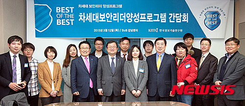 【서울=뉴시스】최재유 미래창조과학부 제2차관과 유준상 한국정보기술연구원장이 12일 오후 서울 강남구 미림타워 BoB강남센터에서 열린 '차세대 보안리더 양성 프로그램 간담회' 에 참석해 차세대 보안리더 양성(BoB) 교육생들과 기념촬영 하고 있다. 2015.03.12. (사진=미래창조과학부 제공)