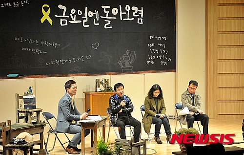 【전주=뉴시스】강명수 기자 = 세월호참사전북대책위원회가 마련한 세월호 북콘서트 '금요일엔 돌아오렴'이 14일 전주중부비전센터에서 열린 가운데 세월호 유가족 유해종씨와 정미현 작가, 복효근 시인이 이야기를 나누고 있다. 2015.03.14.